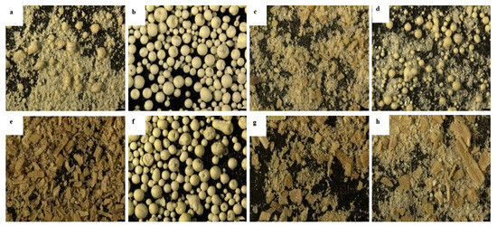 Microscopic photos of phytase products (300×, Exp. 2). These photos of the phytase products were taken using a stereomicroscope (Leica M205 FA, Wetzlar, Germany) at a 300× of view. (a) Phytase 1; (b) Phytase 2; (c) Phytase 3; (d) Phytase 4; (e) Phytase 5; (f) Phytase 6; (g) Phytase 7; (h) Phytase 8.