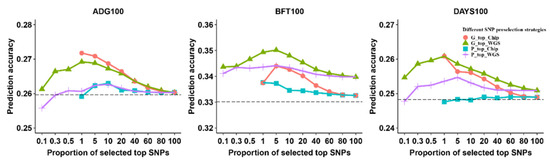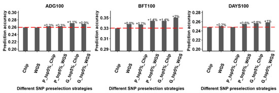 The impact of different alternative strategies for preselecting variants on genome prediction. “Chip” represents all variants from the SNP chip data, and “WGS” represents all variants from the WGS data. “P_top5%_Chip” and “P_top5%_WGS”represent the top 5% of SNPs based on p-value ranking from a large GWAS meta-analysis in the SNP chip and WGS data, respectively. “G_top5%_Chip” and “G_top5%_WGS” represent the top 5% of SNPs based on estimated marker effects from an rr-BLUP analysis in the SNP chip and WGS data, respectively. The dashed lines indicate the value of Chip as a reference. ADG100: average daily gain at 100 kg, BFT100: average back fat thickness at 100 kg, DAYS100: days to 100 kg.