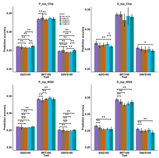 To determine the statistical significance of different weighted models, we performed multiple paired t-tests based on the prediction accuracy of different strategies (Figure 3). For the P_top_Chip strategy, all the prediction models had very limited advantages over GBLUP (Figure 3). The prediction accuracy of the BLUP|GA and TABLUP models for ADG100 was slightly higher (0.15 to 0.28%) than GBLUP, but the difference did not reach significance. The prediction accuracy of the TABLUP model for ADG100 and DAYS100 was significantly higher (0.4 to 0.5%) than other prediction models. For the G_top_Chip strategy, the prediction accuracy of the BLUP|GA model for ADG100 was slightly higher (0.6%) than GBLUP, but the difference did not reach significance (Figure 3). The prediction accuracy of the BLUP|GA model for ADG100 and DAYS100 was significantly higher (0.7 to 0.9%) than the TABLUP model. In the context of the P_top_WGS strategy, the prediction accuracy of the BLUP|GA, GFBLUP, and GTBLUP models for BFT100 displayed significant advantages (0.4 to 0.8%) over the GBLUP model, as illustrated in Figure 3. The prediction accuracy of the TABLUP model for ADG100 and DAYS100 was significantly higher (0.1%) than GBLUP. In addition, the prediction accuracy of BLUP|GA for ADG100 and DAYS100 was significantly higher (0.2 to 0.4%) than the GFBLUP and GTBLUP models. For the G_top_WGS strategy, the prediction accuracy of the BLUP|GA model for three traits was significantly higher (0.1 to 1.0%) than the GBLUP and TABLUP models (Figure 3).