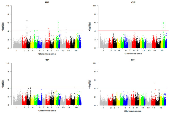 The false discovery rate (FDR) was implemented to determine the suggested threshold values [19] and was set to 0.01. The threshold P FDR value was set to FDR × n/m, in which n is the number of SNPs with p < 0.01, and m is the total number of SNPs. Manhattan and quantile–quantile (Q-Q) plots were drawn using the R package (http://cran.rproject.org/web/packages/gap/index.html) (accessed on 1 February 2023).