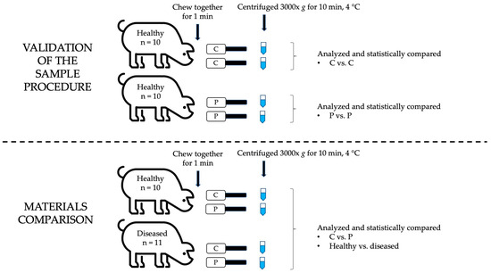 Two equal pieces of cotton (each attached to a flexible thin metal rod) (cotton–cotton combination) were used in 10 healthy pig’s mouths for one minute in order to obtain two different samples (C1 and C2). Similarly, two equal pieces of polypropylene sponge (sponge—sponge combination) were used for obtaining two saliva samples (P1 and P2) from the other 10 healthy pigs. To evaluate whether this sampling procedure produces samples of similar characteristics, the results obtained for the different analytes in samples C1 vs. C2 and P1 vs. P2 were compared. The hypothesis was that the two samples obtained at the same time and from the same materials would not show significant differences between them in the analytes measured due to the sample collection system. Once it was proven that saliva samples with no significant differences in analytes could be obtained using this double collection system, two different collection materials could be tested at the same time with this procedure.