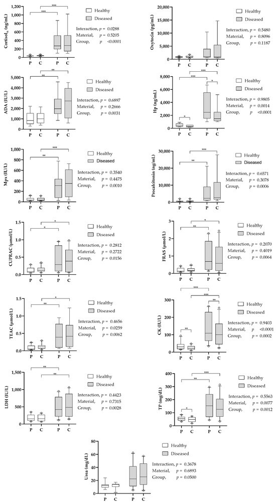 The material used for saliva collection had no significant effect in the cases of cortisol, oxytocin, ADA, Mpx, PCT, CUPRAC, FRAS, TEAC, LDH and urea. On the other hand, the material used for saliva collection significantly affected the results of CK, Hp and TP, which yielded lower values in the samples collected with the cotton roll. When healthy and diseased animals were compared, all analytes showed a similar difference between groups with both cotton rolls and polypropylene sponges, as can be observed in Figure 2.