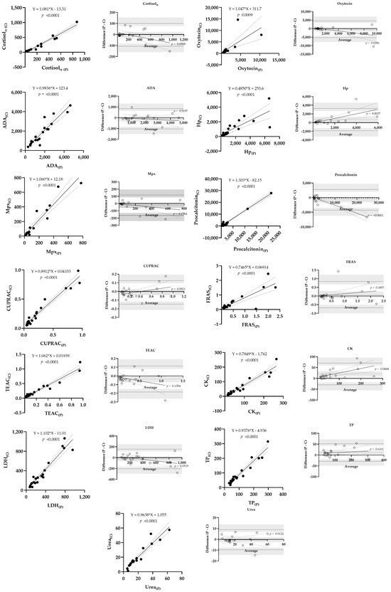 Linear regressions and Bland–Altman plots constructed with the values obtained with the cotton–sponge combination are shown in Figure 3. The regression results showed that the slope was not significantly close to zero in all analytes. Bland–Altman plots showed a bias significantly far from zero (outside the 95% confidence interval) for CK, Hp and TP analyses, with a significant proportional bias for CK and Hp in favor of polypropylene. The rest of the analytes showed a bias within the 95% confidence interval, although proportionality was observed for oxytocin and PCT in favor of cotton.