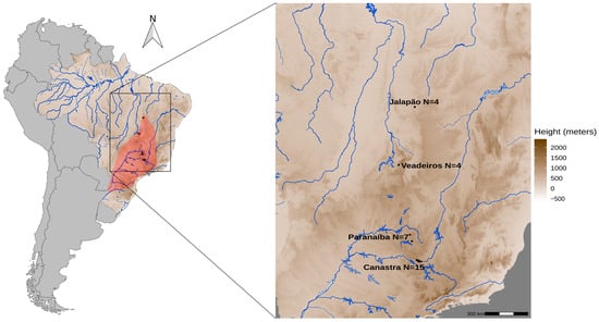 Historical and current population distribution of Mergus octosetaceus. The red area highlights the historical geographic occurrence of M. octosetaceus across Brazil, Argentina, and Paraguay (left map). The black dots represent the collection sites of samples from all four remaining populations in central Brazil (right map in detail): Canastra—Serra da Canastra National Park; Jalapão—Jalapão State Park; Veadeiros—Chapada dos Veadeiros National Park; Paranaíba—Alto Paranaíba region.