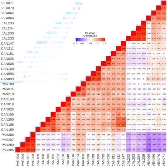 Heatmap depicting kinship indices, corrected by Pearson’s correlation matrix among individuals from Canastra (CAN). Paranaíba (PAR), Veadeiros (VEA) and Jalapão (JAL). The values on the map range from −1 (negative correlation, represented in blue) to 1 (positive correlation, represented in red).