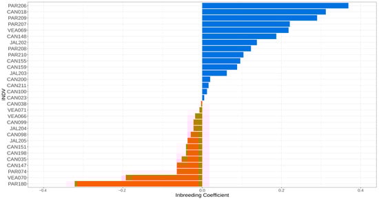 Inbreeding coefficients of 30 Mergus octosetaceus individuals from the four remaining populations (CAN—Canastra, PAR—Paranaíba, VEA—Veadeiros, and JAL—Jalapão). Positive inbreeding coefficients appear in blue (above) and negative ones in brown (below). The samples are in descending order of inbreeding coefficients.