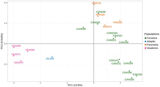 PCA analysis using 923 SNPs for 22 unrelated individuals. Green—individuals from Canastra (CAN); blue—individuals from the Jalapão (JAL); orange—individuals from the Paranaíba (PAR); pink—individuals from Veadeiros (VEA).