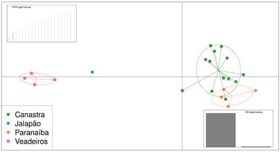 DAPC analysis showed similar results to PCA, separating the same clusters, but the most genetically related individuals are highlighted. We can see that Paranaíba and Canastra individuals form a large group, and they are relatively differentiated from individuals of Veadeiros and Jalapão (Figure 5).