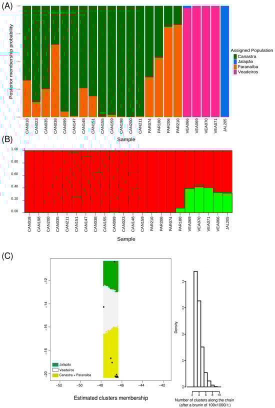 The Compoplot analysis was used to infer the probability of an individual belonging to a given population. The results also showed a close genetic relationship between Paranaíba and Canastra populations, as well as a slight relationship between Veadeiros and Jalapão populations when compared to the Paranaíba + Canastra group (Figure 6A).