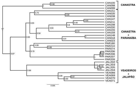 The phylogenetic tree (Figure 7) shows us the same pattern of population clustering that we found in previous analyses, composed of two major groups, Canastra + Paranaíba and Veadeiros + Jalapão, as indicated in other analyses. However, three Canastra individuals (CAN098, CAN099, and CAN100) formed an external cluster related to the two largest ones. These individuals are likely full siblings because of a high kinship coefficient (0.25) that was also confirmed by fieldwork data and, consequently, share many alleles, forming a separate cluster, although in an unrooted BI tree (Figure 7).