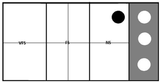 Schematic of the tank seen from above. Thicker lines—division of the three zones of the socialization test (NS, FS, VFS); thinner lines—division of the four sectors of the anxiety test (up/down, left/right); black circle represents the test individual, and white circles represent the shoal. VFS, very far from shoal; FS, far from shoal; NS, near shoal.
