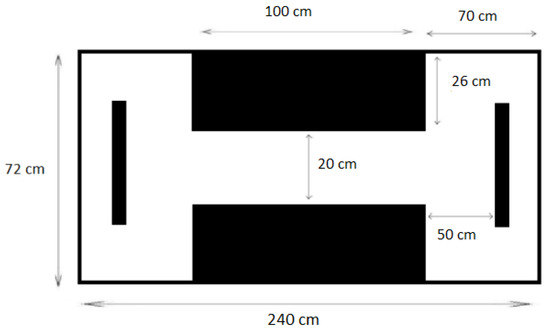 The lateralization assay was carried out in a novel tank with 480 L capacity (240 cm × 72 cm × 36 cm) featuring a maze and two barriers at opposite ends (Figure 2) [13]. Fish were introduced into the tank and placed in the center of the corridor, which remained closed with two grids during the acclimation time (5 min). Once the acclimation was over, the fish were allowed to swim freely, prompted by gentle water movement created using a fishing net, thus facing the obstacle and needing to choose between left and right.