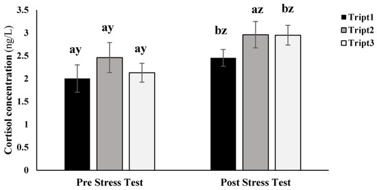 Cortisol blood concentration in the plasma before and after fish were submitted to a stress test consisting of 30 s outside water. Treatments tested three diets with 0.5% (Tript1), 0.6% (Tript2), and 0.8% (Tript 3) of tryptophan in meagre juveniles. Different letters correspond to significant differences between pre and poststress test for the same treatment (a/b) and between pre and poststress test for all treatments (y/z) for p < 0.05.