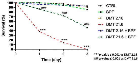 Honeybees treated with deltamethrin (21.6 mg/L) had a survival probability of 38% compared to the control (sugar syrup) at 1 day of treatment. There was therefore a reduced survival, which was statistically significant (p ≤ 0.001) compared to the control group, already from day one of treatment. Even at day two, the difference between the two groups was statistically significant (p ≤ 0.001); on day three, in the deltamethrin-treated group, all subjects had died. The groups fed BPF plus deltamethrin (21.6 mg/mL) after one day of treatment had a survival probability of 86%. At two days post-treatment, the survival probability was 72%, and at three days, it stood at 46%. Therefore, the combination with BPF statistically increased the survival of honeybees compared to those in the group fed deltamethrin at 21.6 mg/mL (p ≤ 0.001).