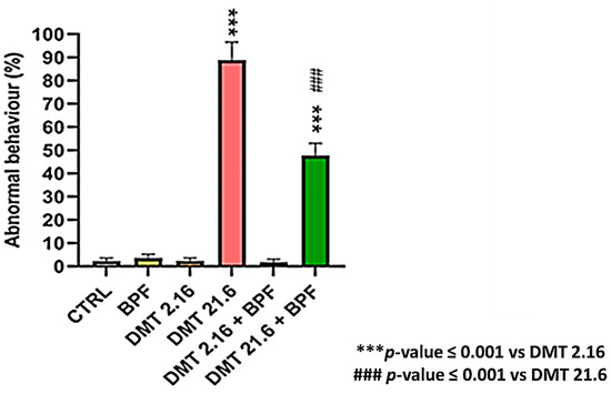 The BPF, deltamethrin 2.16, and deltamethrin 2.16 in combination with BPF groups did not present significant abnormal behaviors compared to the control group. Subjects in the deltamethrin 21.6 groups exhibited the highest percentage of abnormal behavior, involving precisely 88% of all subjects under treatment. The data was statistically significant compared to the control group (p ≤ 0.001). BPF not only increased survival but also reduced the percentage of abnormal behaviors exhibited in a statistically significant manner compared to the deltamethrin 21.6 group (p ≤ 0.001).
