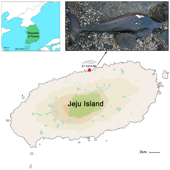 On 14 December 2021, an adult female narrow-ridged finless porpoise (NRFP) (154.8 cm) was stranded on the northern coast of Jeju Island in the Republic of Korea (33°52.667′ N 126°56.450′ E; Figure 1). The carcass was fresh, and no scavengers were found upon retrieval (code 2) [11]. To minimize post-mortem changes, the carcass was immediately transported to the freezer at the College of Ocean Science (Jeju National University, Jeju-si, Jeju-do, Republic of Korea) upon retrieval, and frozen at −22 °C until further examination. Ethical review and approval were not required because this study did not alter aspects of the animal’s life.
