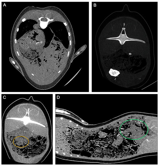 Post-mortem computed tomography (PMCT) images of the individual with suspicion of intestinal adhesion: (A) axial PMCT image (WL330/WW830) showing multiple hyperattenuated lesions secondary to parasitic infections. The lesion was an intramuscular nodule near the left mammary gland. (B) Using an abdominal PMCT algorithm (WL40/WW350), the forestomach content was observable in a coronal PMCT image, suggesting that the porpoise was actively foraging before death. (C) Axial PMCT image (WL40/WW350) showing acute angulation of both bowel loops (orange circle). (D) Coronal PMCT image (WL40/WW350) showing mild hyperattenuation in the stenosed intestine, suggestive of fibrotic scar tissue (green circle).