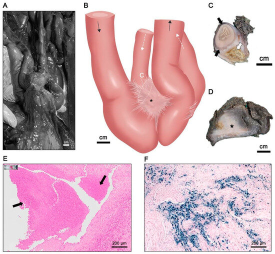 The intestinal lesions of 21-1214-NA. (A,B) Enteroenteric adhesion was observed between two loops of the anterior and posterior jejunum (B was illustrated by S.B.L.). The direction of passage of intraluminal food is indicated by arrows, with black arrows representing the anterior jejunum and white arrows representing the posterior jejunum. The adhesive mesenteric lesion is denoted by an asterisk (*). The loops demonstrated stenosis with (C) acute angulation by (D) the thickened mesentery band with the adhesive lesion indicated by an asterisk (*). Cross-sectioned intestine loops had asymmetrical thickening of the wall (black arrows in (C)) and the mesentery was filled with calcified material (white arrow in (C)). Inflammatory cells were centrally infiltrated in the serosa layer of the loops (black arrows in (E)). No pathogen was identified in gross examination. (F) In the thickened mesentery band, agglomerates of hemosiderin-loaded macrophages were found using Perls Prussian blue staining.