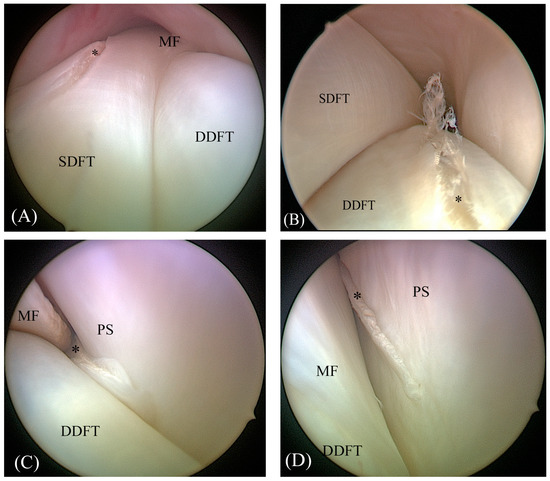 Images of tenoscopically created lesions (asterisk) in the superficial digital flexor tendon (SDFT) (A), the deep digital flexor tendon (DDFT) (B), the manica flexoria (MF) (C) and the proximal scutum (PS) (D).