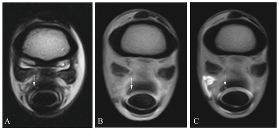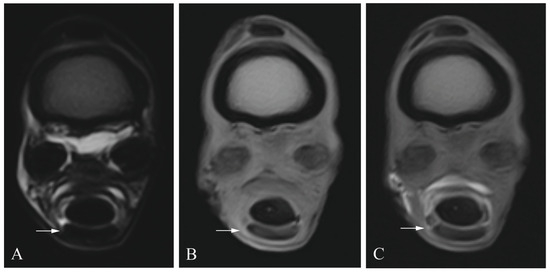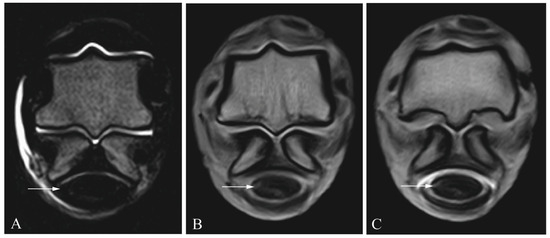 Manica flexoria lesion (arrow) in a cadaveric equine digital flexor tendon sheath: transverse T2 magnetic resonance image (A), transverse T1 magnetic resonance tenographic image (B) and a transverse post-contrast T1 magnetic resonance tenographic image (C) of the same limb.