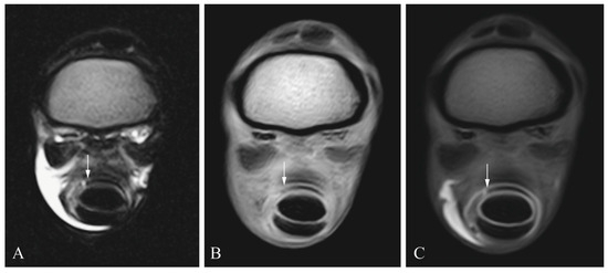 Sensitivity and specificity values for the different soft-tissue structures are shown in Table 1. Figure 2, Figure 3, Figure 4 and Figure 5 show the different lesions visible on the MRI and MRIt. Briefly, MRI and MRIt showed similar sensitivity and specificity values for lesions in the SDFT (MRI (39% sensitivity and 93% specificity) in comparison to MRIt (54% sensitivity, p = 0.72; and 96% specificity, p = 1)). For proximal scutum lesions, sensitivity and specificity were the same for MRI and MRIt (38% sensitivity and 50%, respectively, p = 0.80; 96% specificity and 96%, respectively, p = 1). There was also no statistically significant difference between MRI (34% sensitivity; 100% specificity) and MRIt (32% sensitivity, p = 0.77; 98% specificity, p = 1) for DDFT lesions. MF lesions were detected by MRI with 61% sensitivity, which was also comparable to MRIt (50% sensitivity, p = 0.68). The specificity values (96%) were equally high for MF lesions diagnosed by MRI and MRIt (p = 1).
