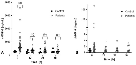 Serum (A) and urinary (B) MMP-9 concentration in 40 dehydrated horses (patients) and 4 control horses. Values shown are the means of six measurements of each sample. The median of all samples is indicated by a horizontal line. Different letters show statistically significant differences over time.