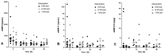 No differences in the sMMP-9, uMMP-9, or uMMP-9/Cr concentrations were found between dehydration groups (Figure 2).