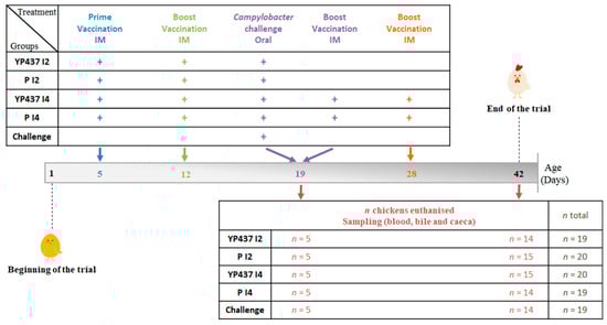Summary of the experimental procedure. The number of chickens (n) necropsied per group on each euthanisation day is shown. For each chicken, 100 µg of recombinant YP437 protein for the vaccinated groups or phosphate-buffered saline (PBS) for the placebo groups was emulsified in MONTANIDETM ISA 78 VG (37/63, w/w). IM: intramuscular route.