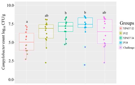 Caecal Campylobacter load on D42. Each point represents one chicken. The inter-group caecal Campylobacter load was compared using the non-parametric Kruskal–Wallis test. Superscript letters represent significant differences (p ≤ 0.05) between groups estimated using the Wilcoxon test.