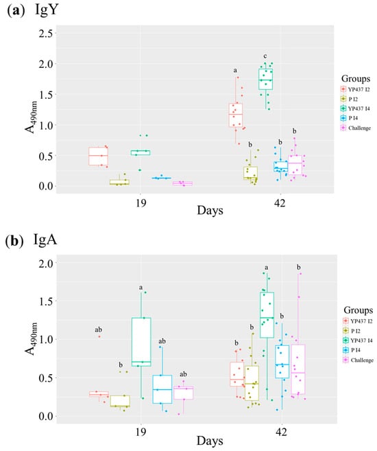 Specific anti-YP437 levels (IgY in serum and IgA in bile) on D19 and D42 in all groups. Each point represents one chicken. (a) Specific anti-YP437 IgY in serum. (b) Specific anti-YP437 IgA in bile. A parametric ANOVA test was used to compare antibody levels between the groups on D19 and D42 when the normality and homogeneity criteria of the variances were validated; otherwise, the non-parametric Kruskal–Wallis test was applied. Superscript letters represent significant differences (p ≤ 0.05) between groups (estimated using the Tukey test after an ANOVA parametric test or the Wilcoxon test after the Kruskal–Wallis test).