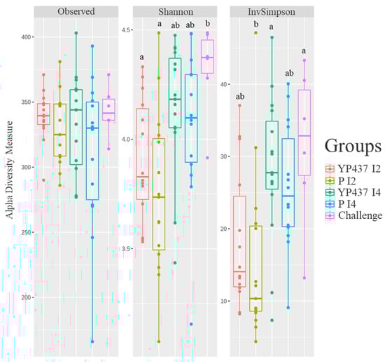 Richness and alpha diversity indices for the chickens’ caecal microbiota on D42. Each point represents one chicken. The parametric ANOVA test was applied to compare the groups. The Tukey test was applied to estimate significant differences (p ≤ 0.05) between groups (represented by superscript letters).