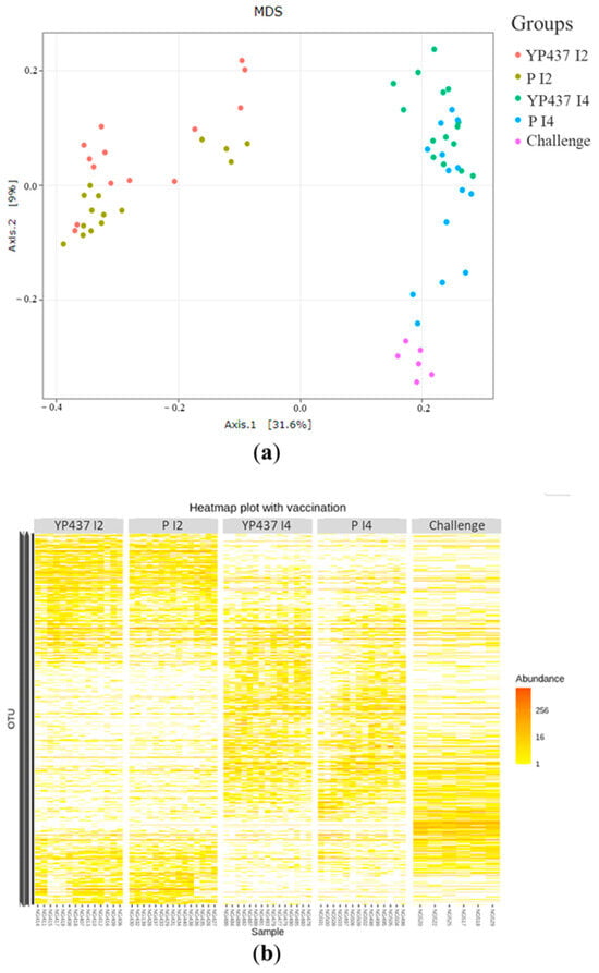 To study the beta diversity, the differences in microbial population structures among the groups were examined by MDS based on the Bray–Curtis distance (Figure 5a). A clear segregation of the YP437 I2 and YP I2 groups from the YP437 I4, P I4 and challenge groups was observed (Figure 5a). These results suggest that OTUs with the greatest relative abundance in the YP437 I2 and P I2 groups differ from those in the YP437 I4, P I4 and challenge groups. The heatmap, which represents the community structure with the relative abundance of OTUs, also confirmed the segregations between the YP437 I2 and YP I2 groups and the YP437 I4, P I4 and challenge groups (Figure 5b). Multivariate ANOVA (performed with Adonis) revealed significant (p ≤ 0.001) differences in the bacterial community structure between groups and the group effect explained 43% of the observed variation.