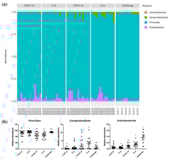 Composition of the caecal microbiota at the phylum level on D42. (a) Relative abundance of the four phyla identified in caecal microbiota represented by a bar for each sample. (b) Relative abundance of the three phyla presenting significant differences between groups. Each point represents one chicken. The non-parametric Kruskal–Wallis test was used to compare the groups. Superscript letters represent significant differences (p ≤ 0.05) between groups (estimated using the Wilcoxon test).