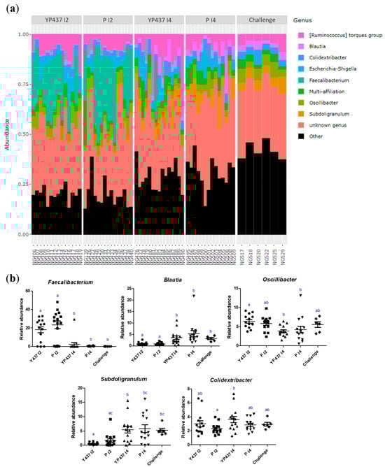 The caecal bacterial composition in each group at the genus level (nine main genera) on D42 is represented in Figure 7. The relative abundance of the Faecalibacterium genus was significantly greater (p ≤ 0.05) in the YP437 I2 and P I2 groups than in the YP 437 I4, P I4 and challenge groups. On the contrary, the relative abundance of Blautia was significantly greater (p ≤ 0.05) in the YP 437 I4, P I4 and challenge groups than in the YP437 I2 and P I2 groups. The relative abundance of Oscillibacter appeared greater in the YP437 I2 and P I2 groups than in the YP 437 I4, P I4 and challenge groups, whereas the relative abundance of Subdogralinum appeared greater in the YP437 I4, P I4 and challenge groups than in the YP 437 and P I2 groups, but these differences were not significant for all the groups. Moreover, the relative abundance of Colidextribacter was significantly greater (p ≤ 0.05) in the YP 437 I4 group than in the P I2 group but not in the other groups tested. However, an elevated inter-individual variability was observed in all the groups tested (Figure 7b). It should be mentioned that considering these nine genera, no significant difference in relative abundance was observed between the vaccinated groups and their respective placebo, indicating that the microbiota modifications observed are not due to the vaccine protein (Figure 7b). In addition, no significant difference was observed between the YP 437 I4 and P I4 groups and the challenge group (Figure 7b). These results are in accordance with the results observed for beta diversity.
