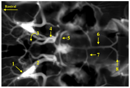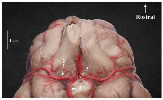 - Skoczylas, B.; Brudnicki, W.; Kirkiłło-Stacewicz, K.; Nowicki, W.; Wach, J. Cortical branches of the middle cerebral artery in silver fox (Vulpes vulpes). Pesqui. Veterinária Bras. 2016, 36, 1053–1057. [Google Scholar] [CrossRef]