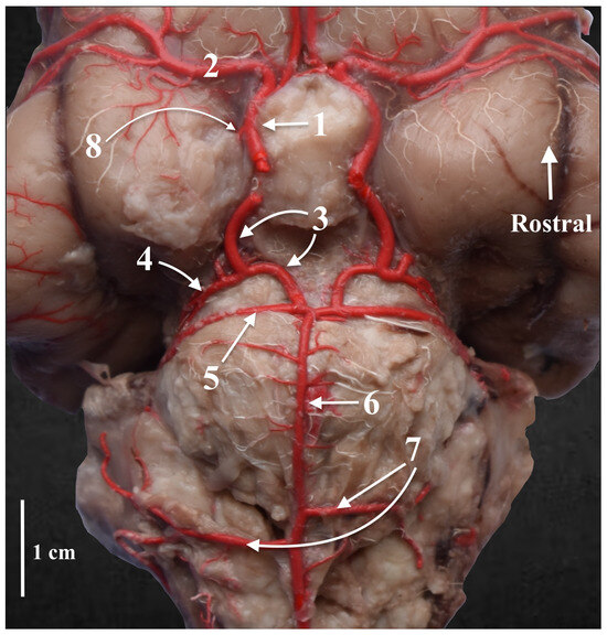 - Al Aiyan, A.; Menon, P.; AlDarwich, A.; Qablan, M.; Hammoud, M.; Shawaf, T.; Richardson, K. Vertebrobasilar contribution to cerebral arterial system of dromedary camels (Camelus dromedarius). Front. Vet. Sci. 2021, 8, 696707. [Google Scholar] [CrossRef]