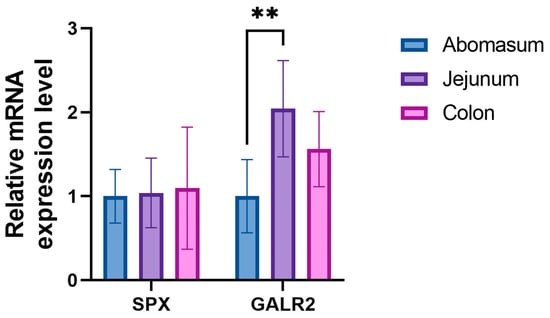 The relative expression of SPX and GALR2 genes in the examined small segments of the bovine gastrointestinal tract (abomasum, jejunum, and colon). Gene expression was normalized by the geometric mean of the RPS9 and ACTB housekeeping genes and presented as relative to the expression level in abomasum. Asterisks (**) indicate significant differences between segments (** p < 0.01).
