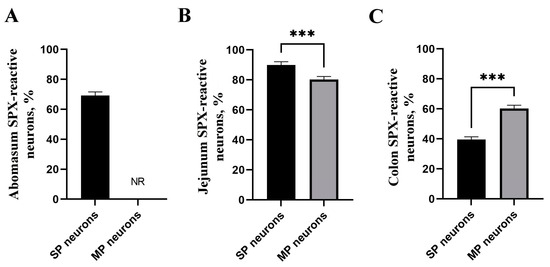 Summary of the percentage of spexin immunoreactive neurons in submucous (SP) and myenteric (MP) plexuses in different sections: (A) abomasum; (B) jejunum; (C) colon of the bovine gastrointestinal tract. Asterisks (***) indicate significant differences in neuron numbers between SP and MP (*** p < 0.001).