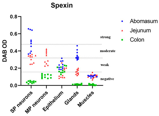 Summary of the intensity of spexin DAB-stained immunoreactivity measured as the optical density (OD) in different cellular structures: submucous plexus (SP) neurons, myenteric plexus (MP) neurons, epithelium, glands, and muscles in the selected sections of the bovine gastrointestinal tract.