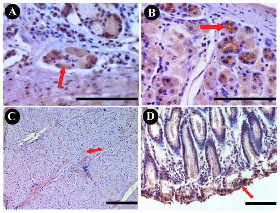 DAB staining of SPX immunoreactivity in bovine abomasum structures: (A) submucous plexus; (B) glands; (C) muscle layers; (D) epithelium. Red arrows indicate positive immunoreactivity. Scale bars: 50 µm.