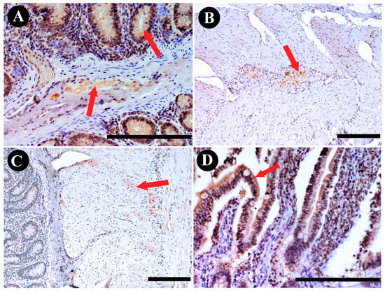 DAB staining of SPX immunoreactivity in bovine jejunum structures: (A) submucous plexus and glands; (B) myenteric plexus; (C) muscle layers; (D) epithelium. Red arrows indicate positive immunoreactivity. Scale bars: 50 µm.