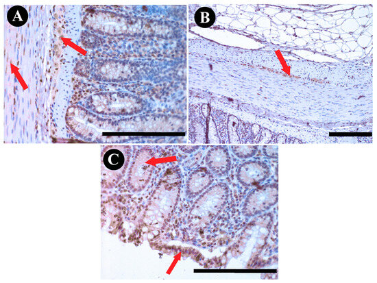 DAB staining of SPX immunoreactivity in bovine colon structures: (A) submucous plexus and muscle layers; (B) myenteric plexus; (C) glands and epithelium. Red arrows indicate positive immunoreactivity. Scale bars: 50 µm.