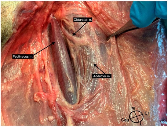 Seven dogs, euthanized for reasons unrelated to this study and without evident musculoskeletal disease, were enrolled. Two fresh cadavers were used for the gross anatomy study, while the other five were frozen after euthanasia and thawed at ambient temperature before the procedure. With the dog lying in dorsal recumbency and the pelvic limb in a neutral position, the inguinal region was dissected on both sides to evaluate the obturator nerve pathway.