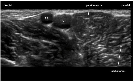 Ultrasound image of the region inspected for the obturator nerve block: the pectineous muscle appears as a heart-shaped structure. Fa, femoral artery; Fv, femoral vein.