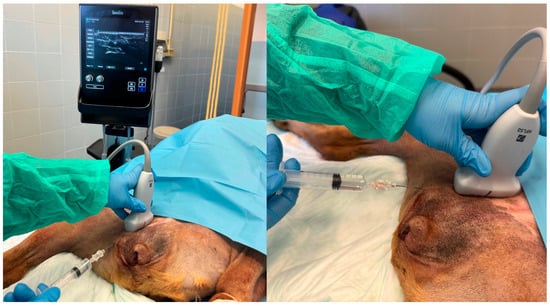 - Di Franco, C.; Tayari, H.; Nardi, S.; Briganti, A. Along or across the visual axis: A comparison of two ultrasound screen, needle and transducer orientation techniques. Vet. Anaesth. Analg. 2021, 48, 147–150. [Google Scholar] [CrossRef] [PubMed]