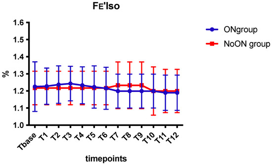 No difference was found between the two groups regarding PE’CO2, Fe’Iso (Scheme 1), HR, SAP, MAP, and DAP. In the ON group, 3/15 dogs received dopamine infusion, while in the NoON group, 4/15 received it, and no differences were detected. Moreover, no differences were detected in the use of atropine: 2/15 in the ON group and 4/15 in the NoON group.