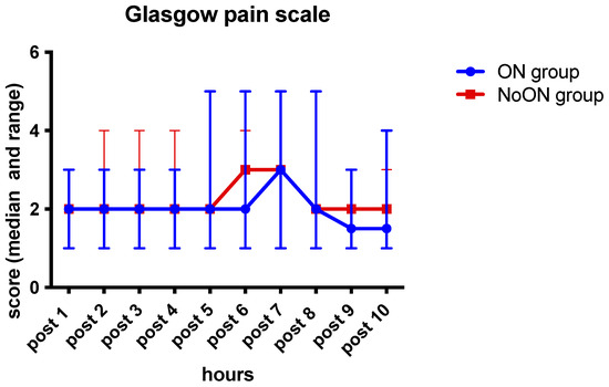 Five dogs for each group required rescue methadone in the first ten hours postoperation. The median pain scores of the two groups are summarized in Scheme 2.