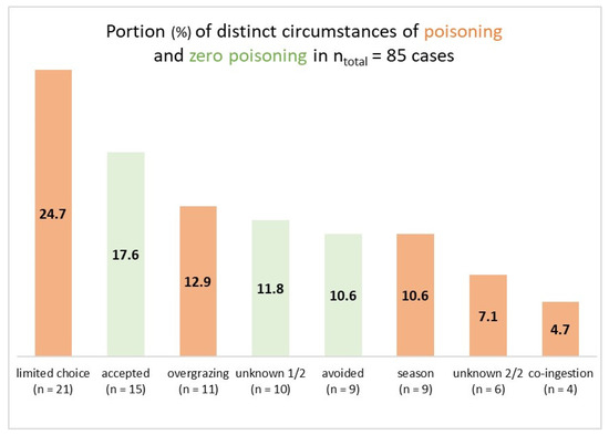 Distribution of poisoning (red columns) and zero poisoning (green columns) in percentage and number of cases. Only proven cases were considered (B-E; see Table 2). Abbreviations of the circumstances: “limited choice” = poisoning associated with limited choice of feed; “accepted” = no poisoning, yet ingestion of poisonous plants; “overgrazing” = feed sources were exhausted; “unknown 1/2” = circumstances of zero poisoning were not described; “avoided” = no poisoning, no ingestion of poisonous plants; “season” = poisoning associated with seasonally scarce feed; “unknown 2/2” = circumstances of poisoning were not described; “co-ingestion” = grass covered the poisonous plant that animals incidentally co-ingested.