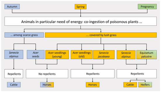 Seasonally scarce feed meant either too little feed during times of drought or inadequate feed outside the core pasture season. In any case, pasture biomass was extremely reduced, causing nutrient deficiency in farm animals over long periods. Moreover, the concentration of plant secondary metabolites was higher in certain developmental stages in two plant species involved in that scenario: (1) In springtime, the concentration of hypoglycin A in Acer pseudoplatanus was higher in seeds and seedlings than in the adult leaves [54]. (2) In summertime, the concentration of alkaloids in Senecio jacobaea was higher in flowers than in the leaves [55]. Under such circumstances, nine cases of poisoning happened on pastures with nine plant species involved (Table 5).