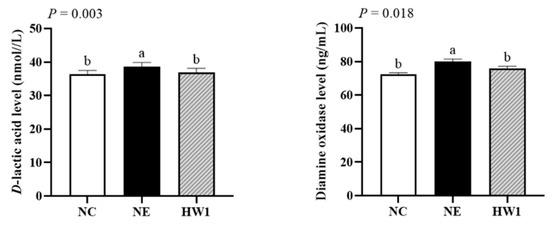 From each replicate (6 broilers per group), 0.1 g ileum mucosa sample was homogenized with 0.9 mL normal saline. The supernatant was collected by centrifugation (3000× g) for 10 min. The levels of D-lactic acid and DAO in serum, and the levels of interleukin (IL) 1β, IL-6, IL-10, tumor necrosis factor-α (TNF-α), interferon-γ (IFN-γ), and secretory immunoglobulin A (sIgA) in the ileal mucosa were determined using ELISA kits from Jiangsu Meimian Industrial Co., Ltd. (Yancheng, China). Ileum mucosa samples were homogenized and measured for protein concentration using enhanced BCA protein assay kit (Biyuntian Biotechnology Co., Ltd., Shanghai, China), and values were expressed per milligram of protein.